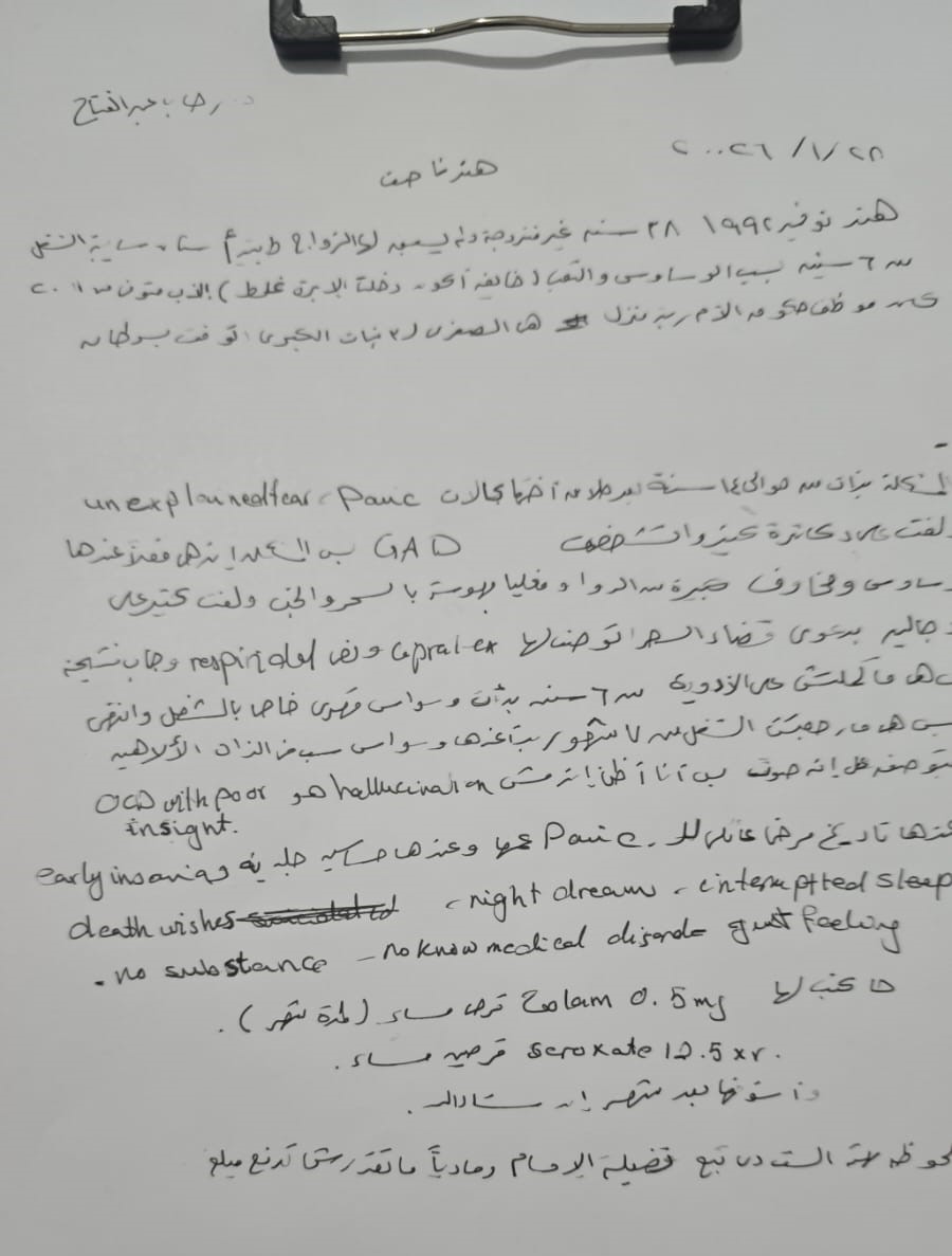 Edit Patient Info Code Gender Gender Male Female First Interviewer Alaaabdelhady asmaaragab Kareemhafzy Kerolos_Botros Mahmoudsa3d Mervat069 monaelgebaly nabilelkot Olabrakat Rehab.mohammed shaymaamady sohaylasamy Aelsherbiny Doaa Abeer Mahmoud Ibrahim Younis Aya Elsayed Mohammed Elsherbiny Mostafa Mahdi Tommie Van Otterloo Shaimaa Mostafa Omkolthom Hamdy Bassem Zaki Kholod Ali Mariam Shehata Seconed Interviewer Alaaabdelhady asmaaragab Kareemhafzy Kerolos_Botros Mahmoudsa3d Mervat069 monaelgebaly nabilelkot Olabrakat Rehab.mohammed shaymaamady sohaylasamy Aelsherbiny Doaa Abeer Mahmoud Ibrahim Younis Aya Elsayed Mohammed Elsherbiny Mostafa Mahdi Tommie Van Otterloo Shaimaa Mostafa Omkolthom Hamdy Date Of First Interview Attachment 2.jpg Summary Diagnosis/Notes Social Allergy Family History Family History No Yes Follow Up Depressive symptoms Depressive symptoms Depressed mood Anhedonia Decrease concentration Easy fatigability Death wishes Suicidal ideations/plans/attempts Hopelessness / helplessness Sense of suffocation Significant weight loss Insomnia Psychomotor retardation Psychomotor agitation Excessive guilt Manic symptoms Manic symptoms Irritable/elated mood Volubility Flight of ideas Decrease need for sleep Easy distractibility Inflated self-esteem Increase goal directed activities Hyperactivity Involvement in risk activities Delusions Delusions General delusions Bizzare Delusion Acting out No acting out Others Hallucinations Hallucinations Auditory Non auditory Acting out No acting out Perception illusion Others Sleep Sleep Insomnia Interrupted sleep sleepiness Cataplexy Night mares Obstructive apnea/ hypopnea Sleep walking Appetite Appetite Decrease appetite Increase appetite Eating non-food substance Repeated regurgitation of food Restriction of eating Recurrent binge eating Recurrent compensatory behavior Sexual symptoms Sexual symptoms Decrease desire Increase desire Erectile dysfunction Premature ejaculation Anorgasmia Dyspareunia Paraphilia Gender incongruence Agitation Agitation Yes No Aggression Aggression Verbal Physical sexual Destruction Homicide Obsessions/ compulsions Obsessions/ compulsions Obsessions Compulsions Hoarding Body dysmorphia Skin picking Hair bulling Suicide Suicide Death wishes Ideations Plans Attempts current Prior attempts Anxiety symptoms Anxiety symptoms Mental symptoms Physical symptoms Ill-defined fear Specific phobias Panic attacks PTSD Symptoms PTSD Symptoms Intrusive memories (thoughts- feelings- images- nighmares) Hyperarousal Avoiding dissociation Negative thinking Mood changes Somatic symptoms Somatic symptoms Hypochondriasis Conversion Induction of disease or physical symptoms Falsification of physical/psychological symptoms Dissociative symptoms Dissociative symptoms Depersonalization/ derealization Others Neurocognitive symptoms Neurocognitive symptoms Learning / Memory Attention Language Social cognition Self care House keeping Daily activities Ambutaion????? Speech Speech Delay Stuttering Vocal tics Others Intellectual functions Intellectual functions Daily activity Social functions Cognitive ?????? Others Restricted/repetitive behavior Angry/irritable mood Restricted/repetitive behavior Angry/irritable mood loses temper touchy resentful Others Argumentative/defiant behavior: Vindictiveness (Aggression) Argumentative/defiant behavior: Vindictiveness (Aggression) aggressive impulses verbal bullying threatening physical animal People Propities Sixual Stealing Setting fire Others Enuresis Enuresis Primary Secondary Others Encorporesis Encorporesis Primary Secondary Others Attention Attention Attention deficit Forgetfulness Easily distracted Others Activity Activity Hyperactivity Hypoactivity Others Motor Motor Ticks Delayed motor development Soft motor skills Sleep development Gender identity Others Personality-ClusterA Personality-ClusterA Pervasive distrust Detachment from social relationships Odd beliefs / thinking Personality-ClusterB Personality-ClusterB violations of rights Impulsivity Unstable relationships Unstable sense of self DSH Dramatization Ego inflation Personality-ClusterC Personality-ClusterC Social inhibition Difficulty in everyday decisions without help Details oriented Perfectionism Rigidity Anxiety & Cluster C Substance abuse/dependence Substance abuse/dependence Harmfull use Craving Withdrwal symptoms Unable to control use Others Impairement of functioning Impairement of functioning Understanding and communication Getting around Self care Getting along with people Life activities (House hold) Life activities (school /work) Participation in society Others Severity Severity 1 2 3 4 5 6 7 8 9 10 Save Your Changes Back to List